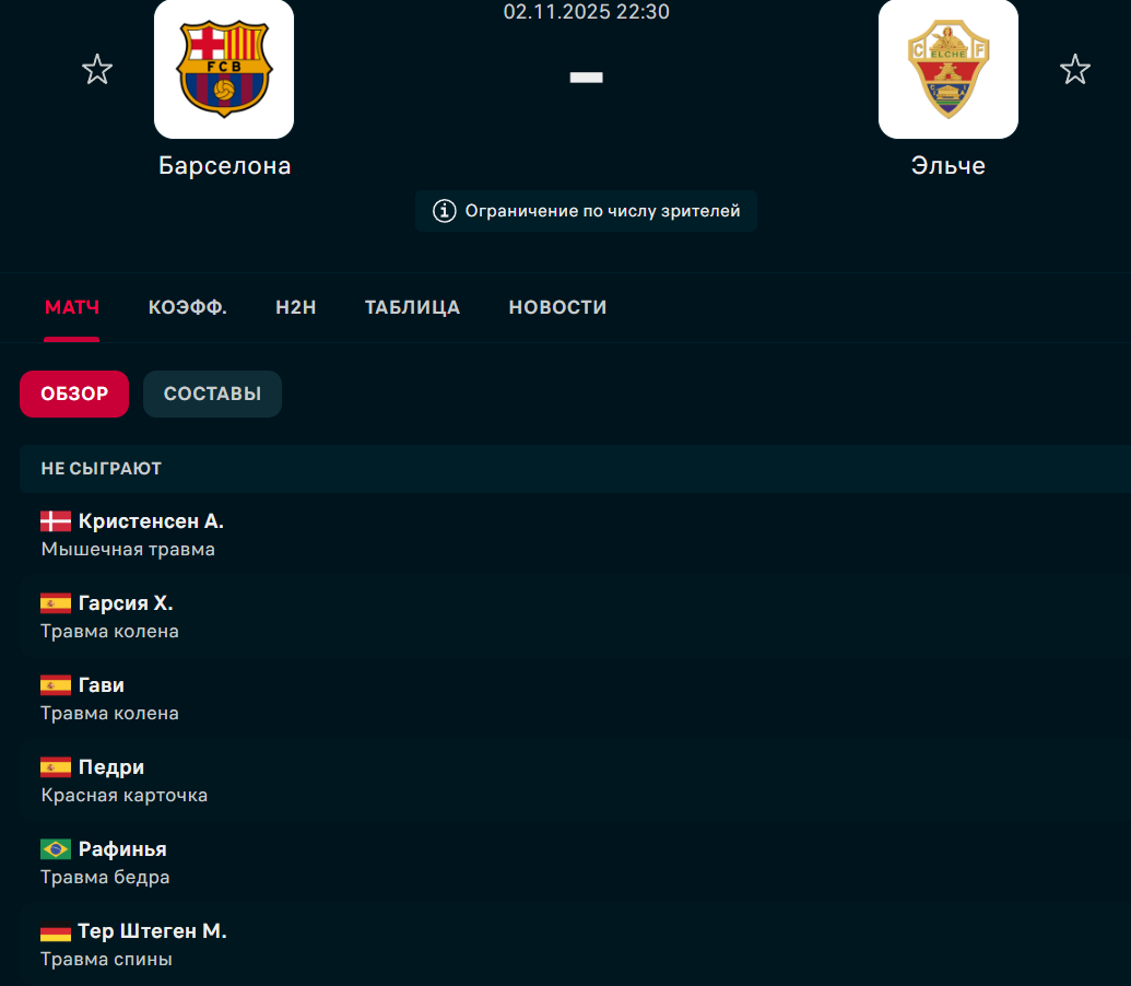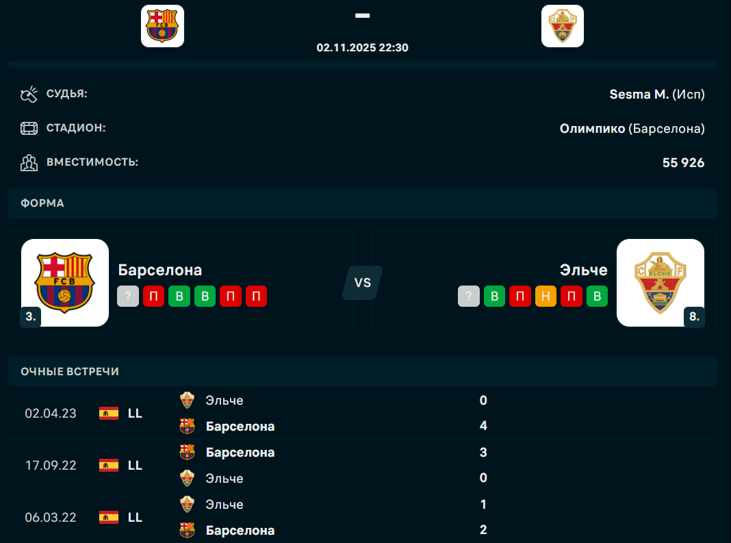 2 ноября 2025 года в Барселоне состоится матч 11-го тура чемпионата Испании по футболу между каталонской "Барселоной" и "Эльче", сообщает Спорт Шредингера.