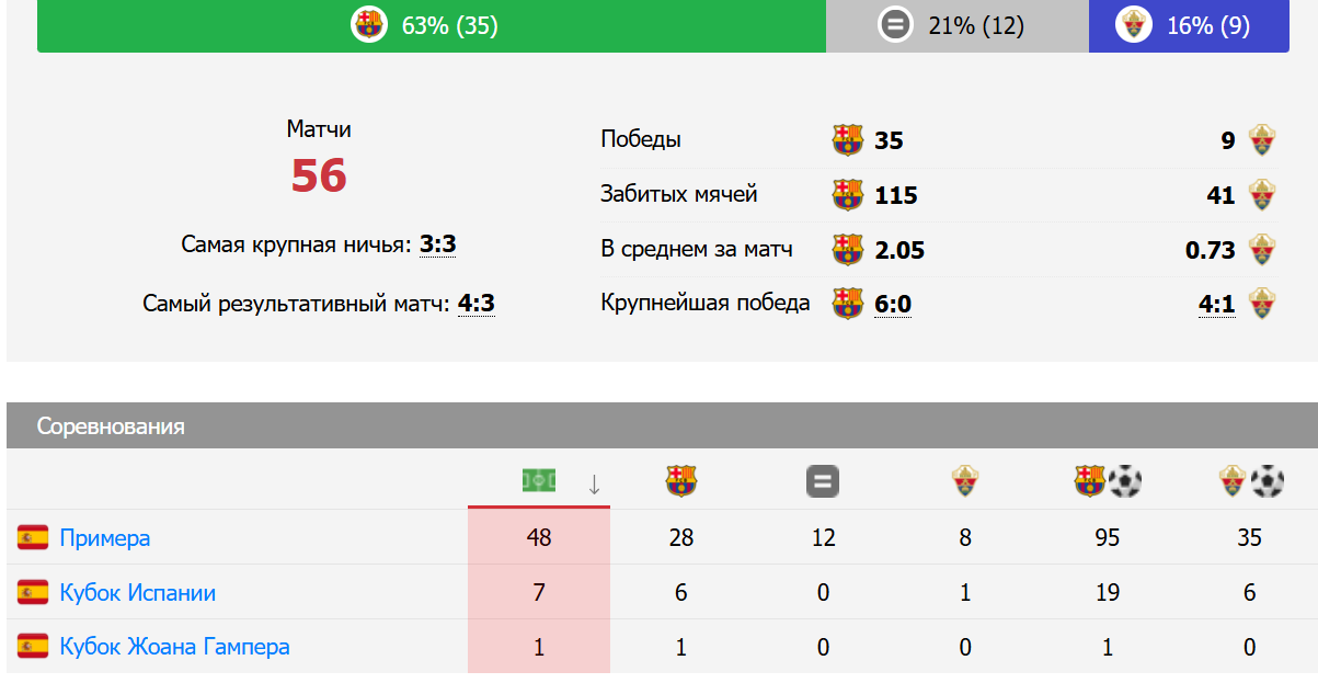 Соперники провели 56 матчей, из которых 35 завершились в пользу каталонцев, а 9 победами "Эльче". Еще 12 окончились вничью."Барселона" забила 115 голов в ворота "Эльче" за всю историю встреч, а последние всего 41.