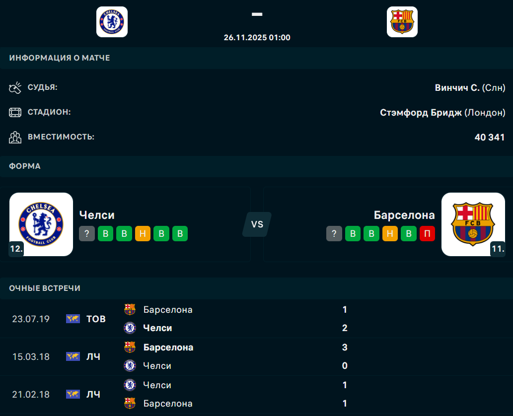В ночь с 25 на 26 ноября состоится матч 5-го тура общего этапа Лиги чемпионов, в котором встретятся английский "Челси" и каталонская "Барселона", сообщает Спорт Шредингера.