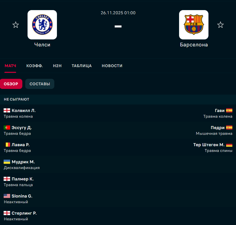 У команды не смогут сыграть Колвилл, Эссугу, Лавиа, Мудрик, Палмер, Слонина и Стерлинг.