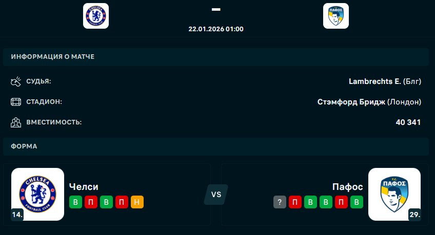В ночь с 21 на 22 января состоится матч 7-го тура общего этапа Лиги чемпионов, в котором встретятся английский "Челси" и кипрский "Пафос", сообщает Спорт Шредингера.