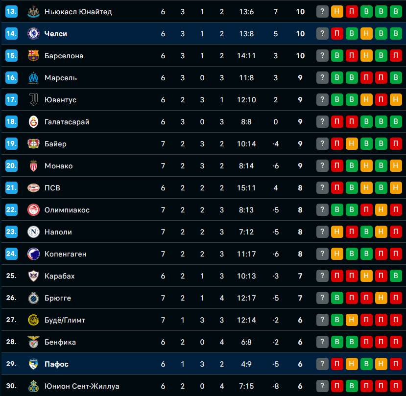 После шести туров "Челси" идет на 14-ой строчке с 10 баллами, а "Пафос" с шестью очками располагается на 29-ой позиции.
