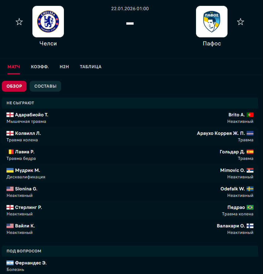 У "Челси" не сыграют Адарбиойо, Колвилл, Лавиа, Мудрик, Слонина, Стерлинг и Вайли. "Пафос" не сможет рассчитывать на Брито, Аруахо корря, Гольдара, Мимовича, Одефалька, Педраю и Валакари.