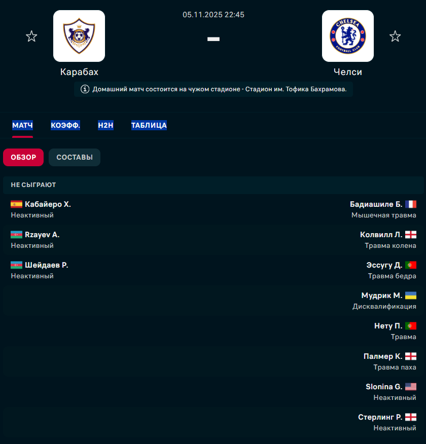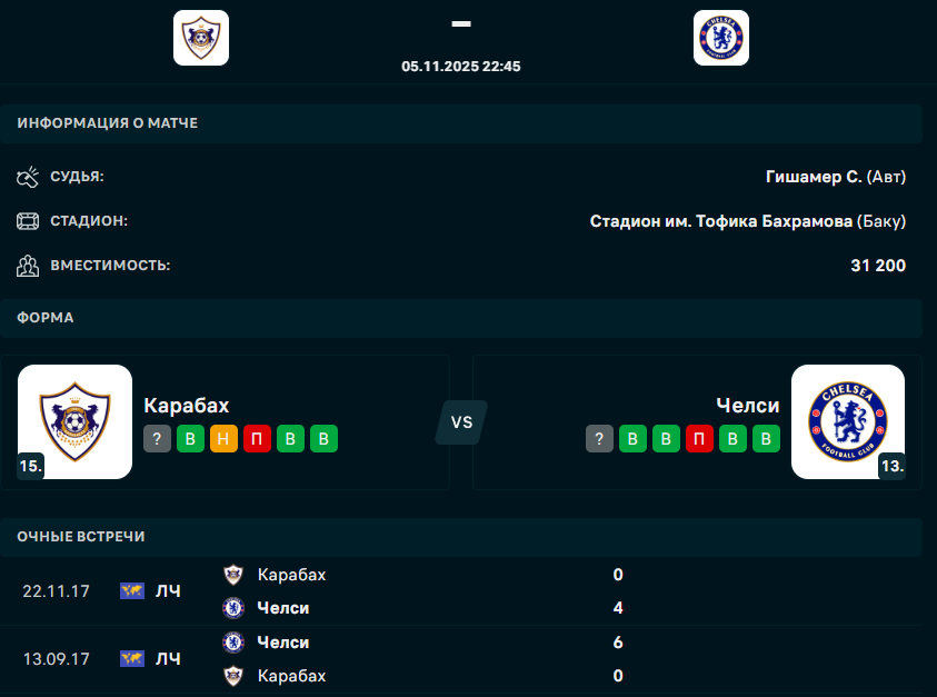5 ноября состоится матч 4-го тура общего этапа Лиги чемпионов, в котором встретятся азербайджанский "Карабах" и английский "Челси", сообщает Спорт Шредингера.