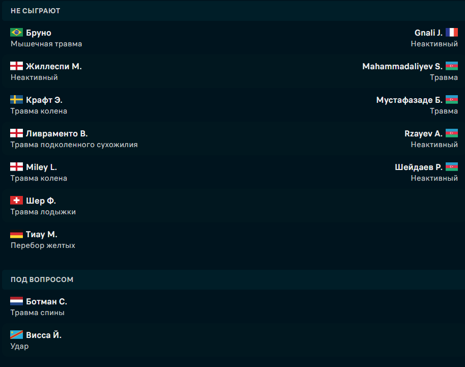 У "Ньюкасла" в этой игре не сыграют Бруно, Жиллеспи, Крафт, Ливраменто, Милей, Шер и Тиау. У "Карабаха" точно на поле не выйдут Гналич, Махамадалиев, Мустафадзе, Рзайев и Шейдаев.