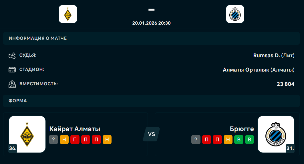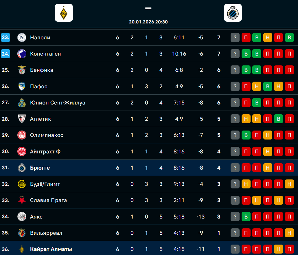 После шести сыгранных туров "Кайрат" набрал одно очко и идёт на последнем, 36-м, месте в турнирной таблице общего этапа главного еврокубка. "Брюгге", в свою очередь, имеет 4 балла и располагается на 30-й строчке.