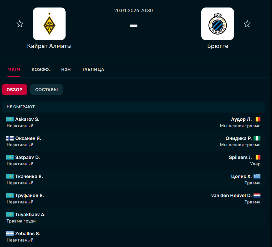 У "Кайрата" точно не сыграют Аскаров, Оксанен, Сатпаев, Ткаченко, Труфанов, Туякбаев и Себальос. "Брюгге" не сможет рассчитывать на Аудора, Онидика, Шпиллерса, Цолиса и Ван ден Хойвила.