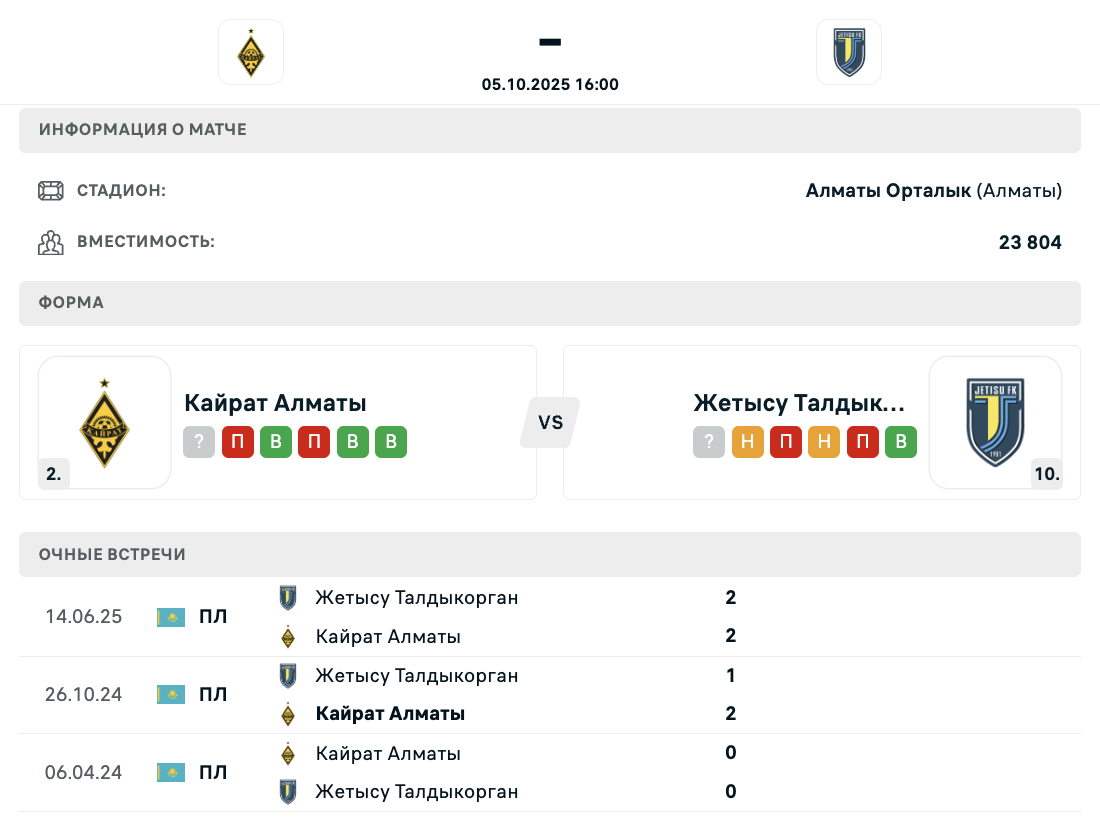 5 октября 2025 года в 16:00 по времени Казахстана алматинский "Кайрат" примет талдыкорганский "Жетысу" в рамках 24-го тура Казахстанской Премьер-лиги, сообщает Спорт Шрёдингера.