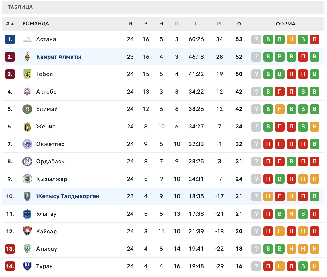 - "Жетысу" располагается на десятой строчке и не может выиграть уже четыре матча подряд - две ничьи и два поражения.