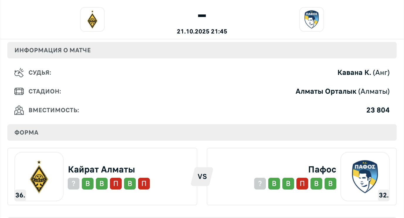 "Пафос" также имеет опыт матчей с казахстанскими командами: в прошлом сезоне киприоты дома победили "Астану" 1:0.