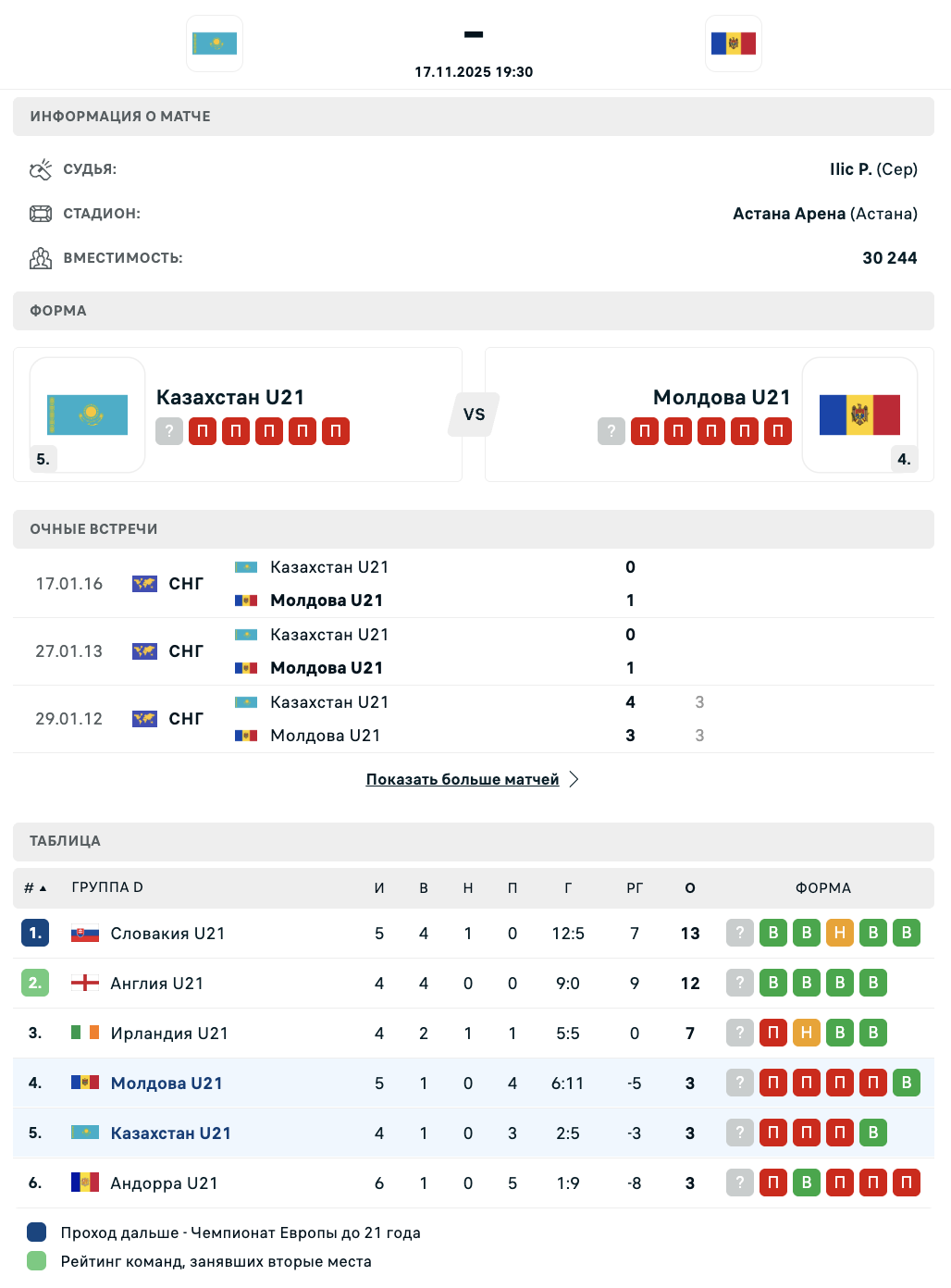Прямая трансляция матча Казахстан - Молдова в отборе Евро-2027 U21