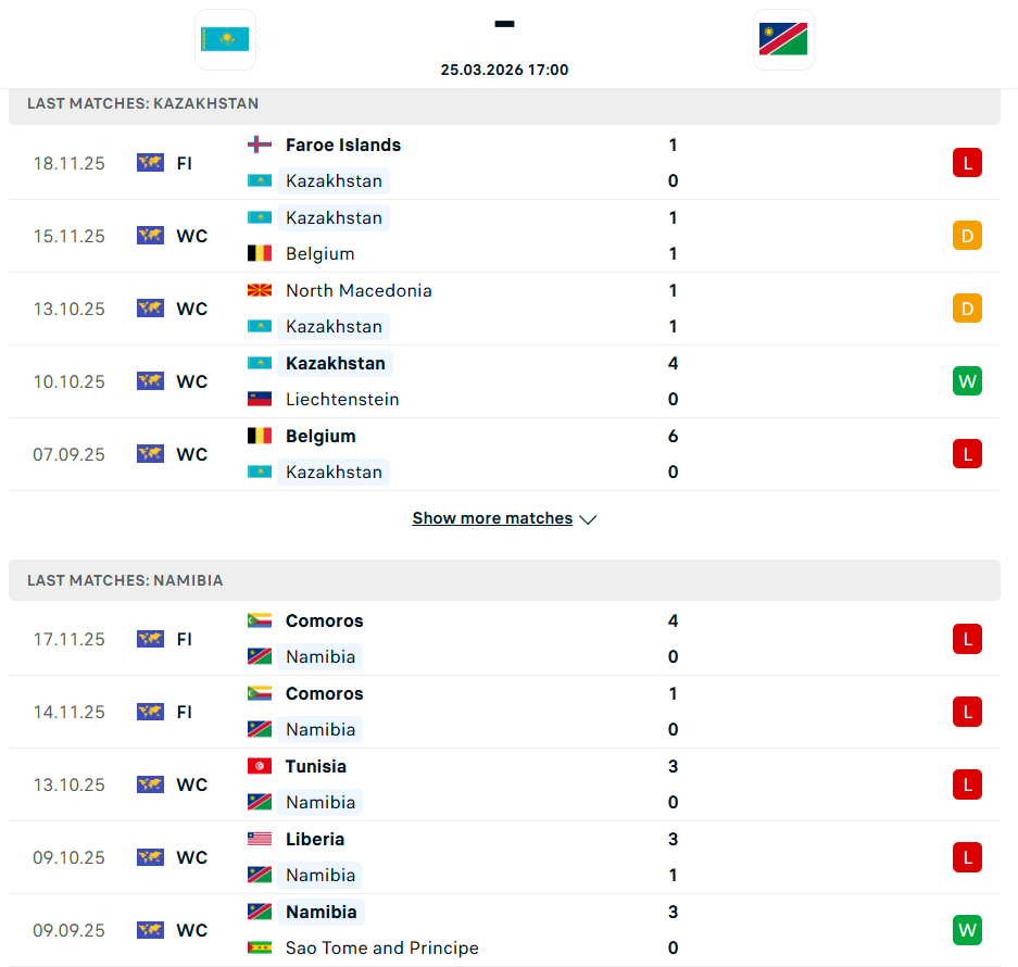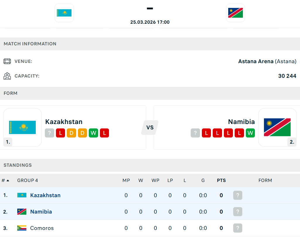 В пяти последних матчах Казахстан выиграл одну, два раза сыграл вничью и дважды проиграл. У Намибии четыре поражения и лишь одна победа в пяти встречах.