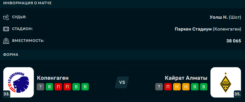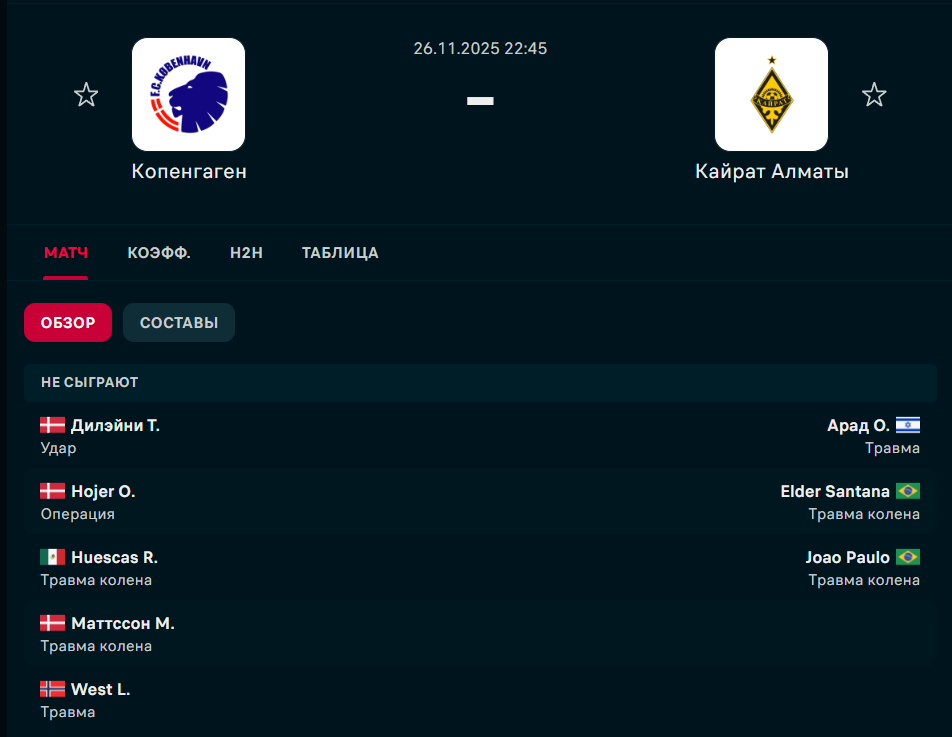 26 ноября состоится матч 5-го тура общего этапа Лиги чемпионов, в котором встретятся датский "Копенгаген" и алматинский "Кайрат", сообщает Спорт Шредингера.