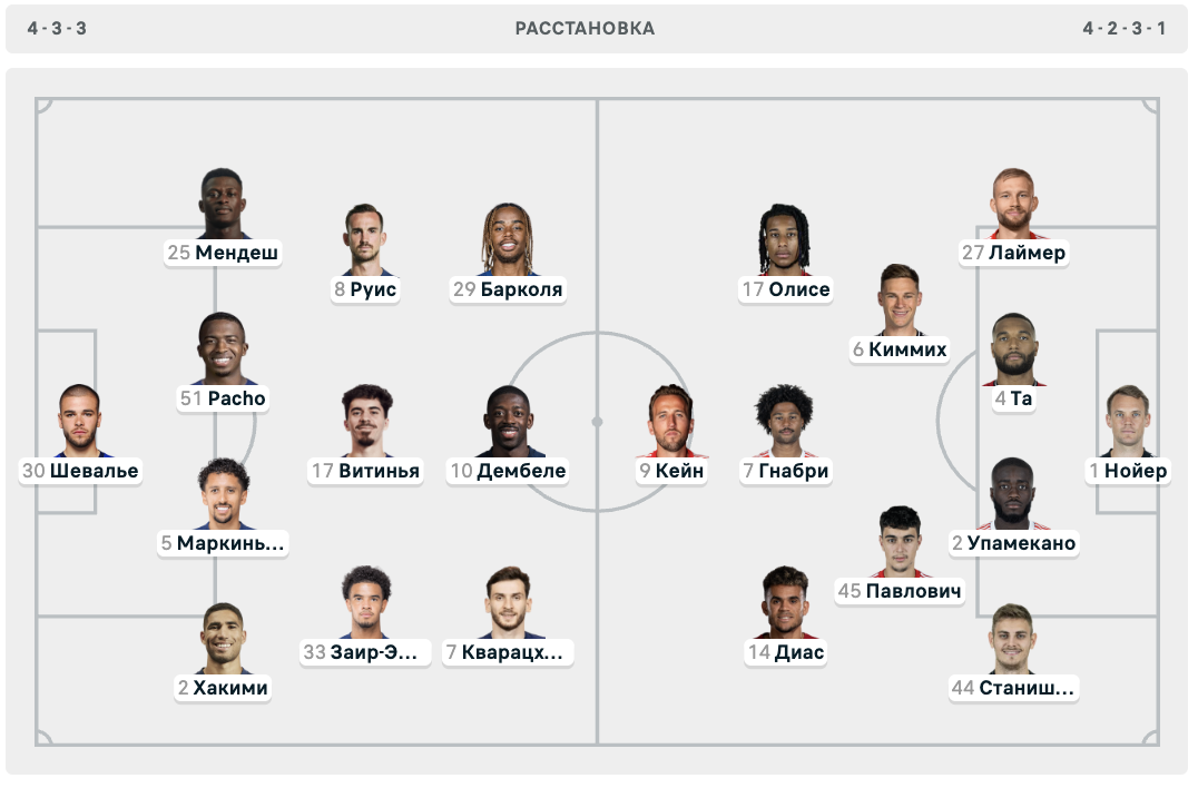"Пари Сен-Жермен": Шевалье, Хакими, Пачо, Маркиньос, Мендеш, Заир-Эмери, Витинья, Руис, Кварацхелия, Дембеле, Барколя