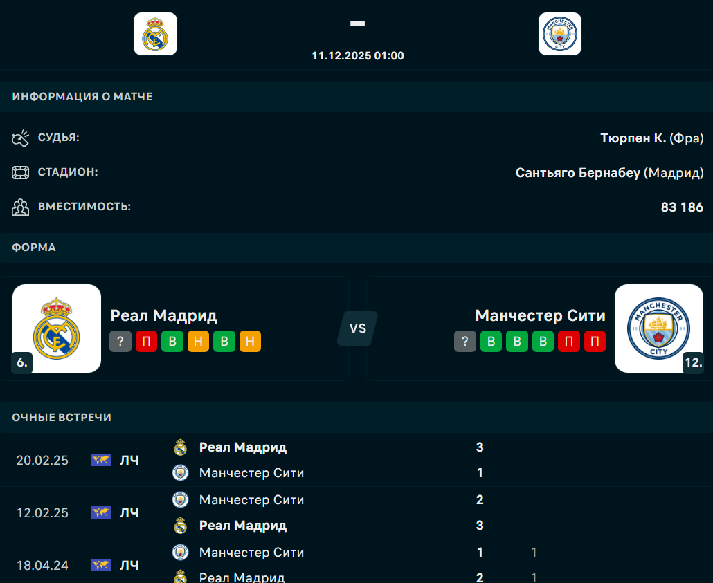 В ночь с 10 на 11 декабря состоится матч 6-го тура общего этапа Лиги чемпионов, в котором мадридский "Реал" примет английский "Манчестер Сити", сообщает Спорт Шредингера.
