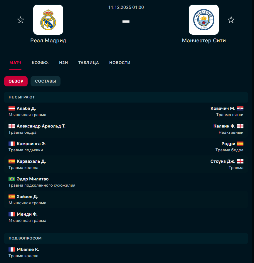 У "Реала" точно не сыграют Алаба, Камавинга, Трент, Милитао, Хейзен и Менди. Под вопросом участие Киллиана Мбаппе. "Манчестер Сити" не сможет рассчитывать на Ковачевича, Калвина, Родри и Стоунза.