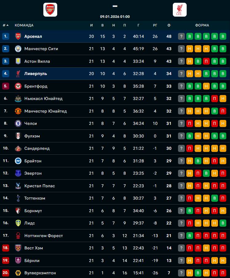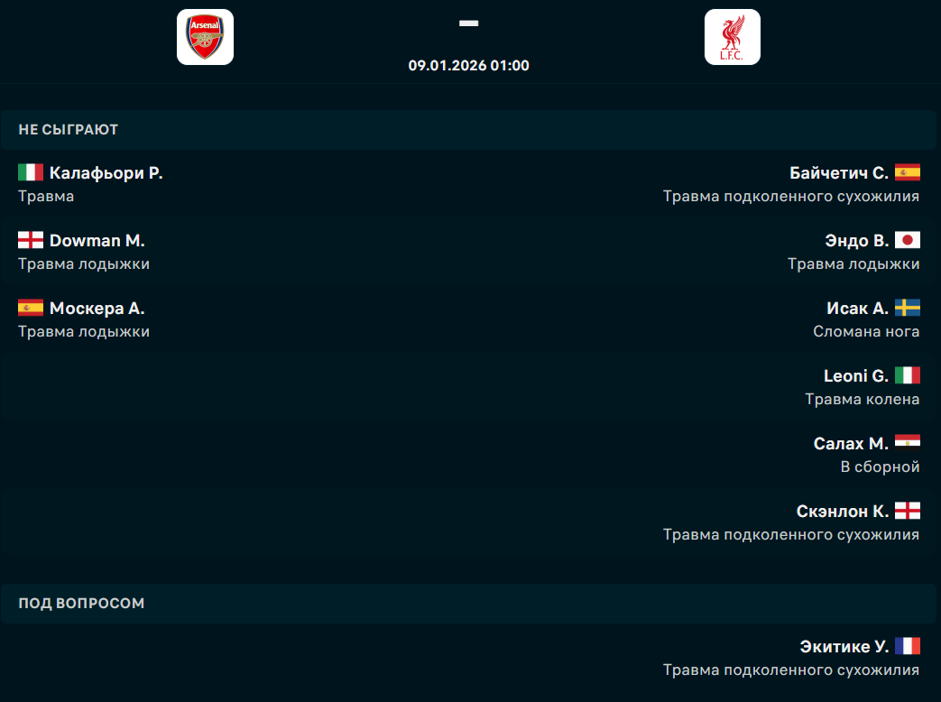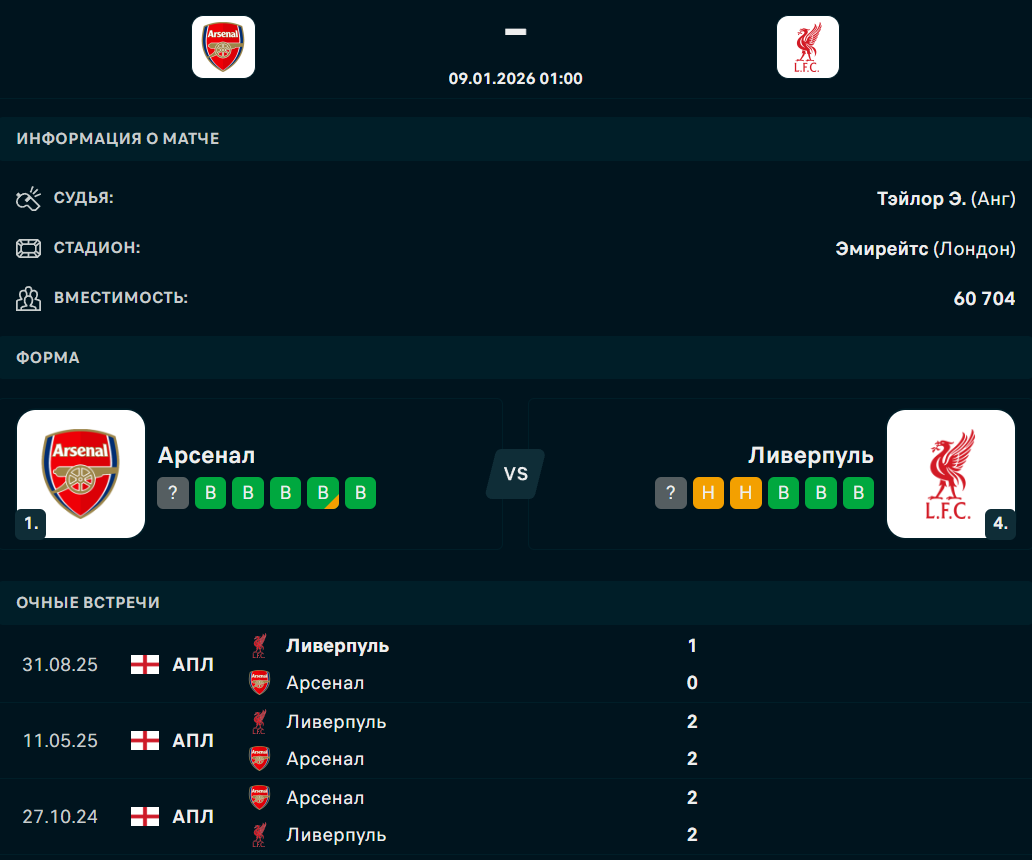 В ночь с 8 на 9 января на стадионе "Эмирейтс" в Лондоне состоится матч 21-го тура английской премьер-лиги, в котором "Арсенал" встретится с "Ливерпулем", сообщает Спорт Шредингера.