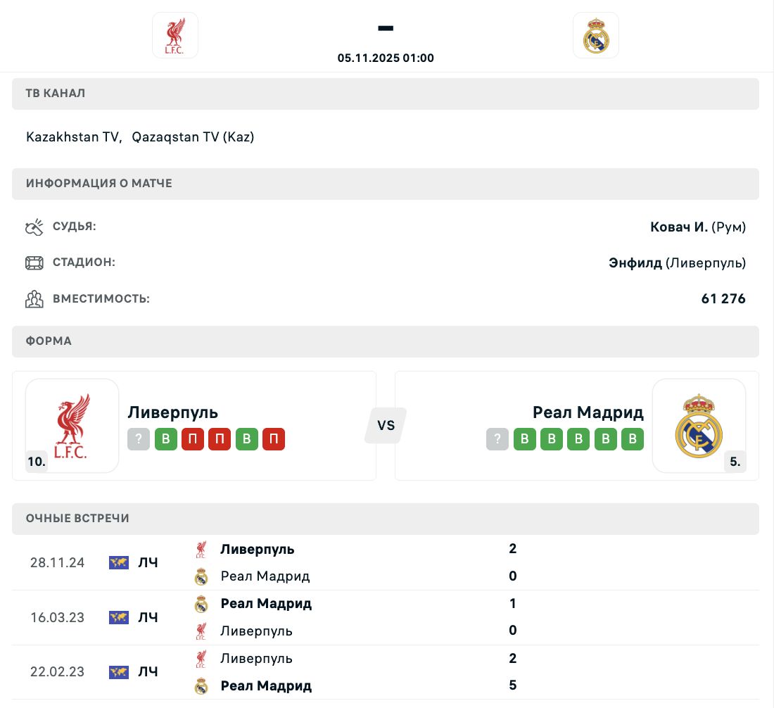 Ночью 5 ноября на легендарном стадионе "Энфилд" в Ливерпуле, вмещающем 61 276 зрителей, "Ливерпуль" примет мадридский" Реал" в рамках четвертого тура общего этапа Лиги чемпионов, сообщает Спорт Шредингера.
