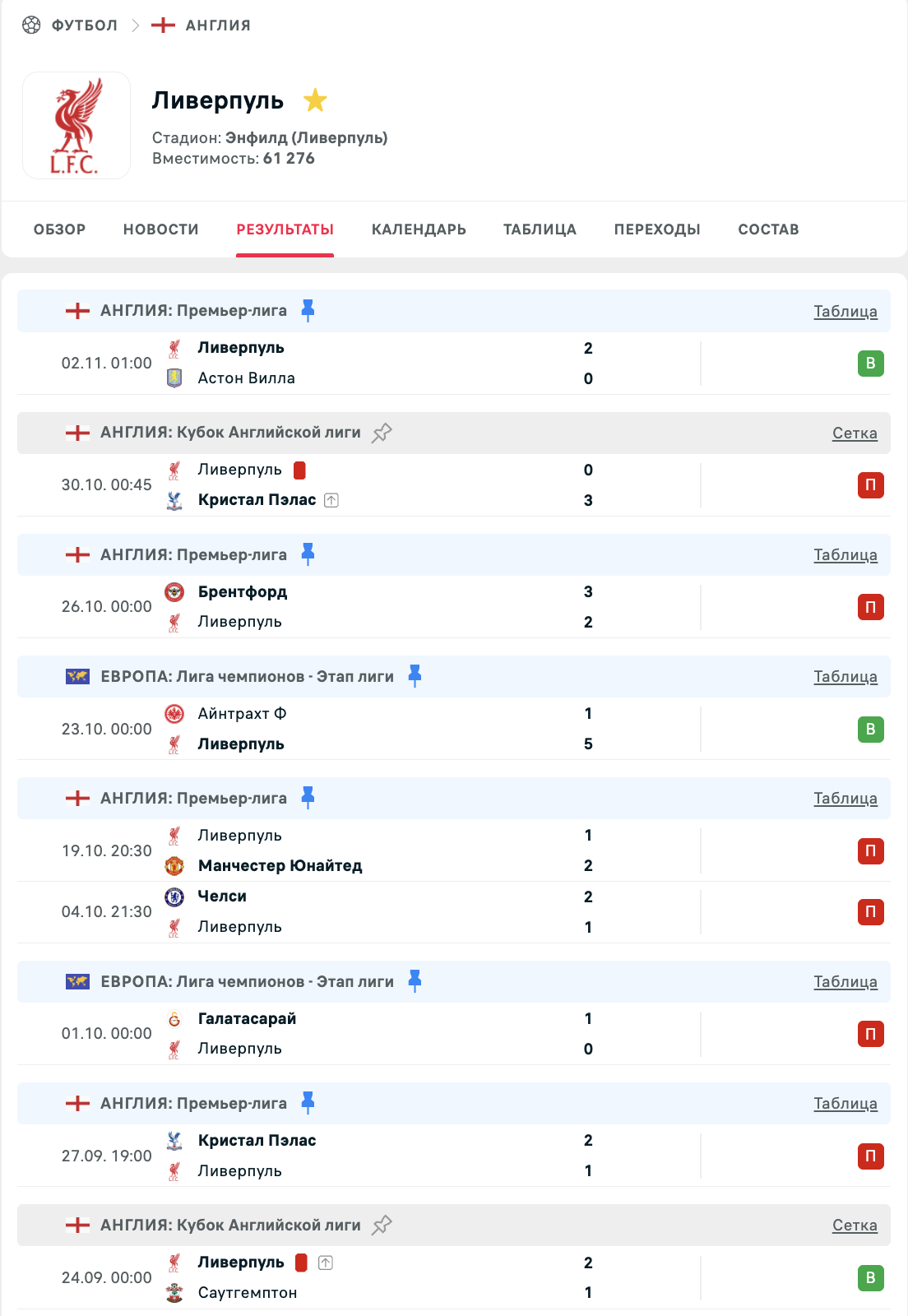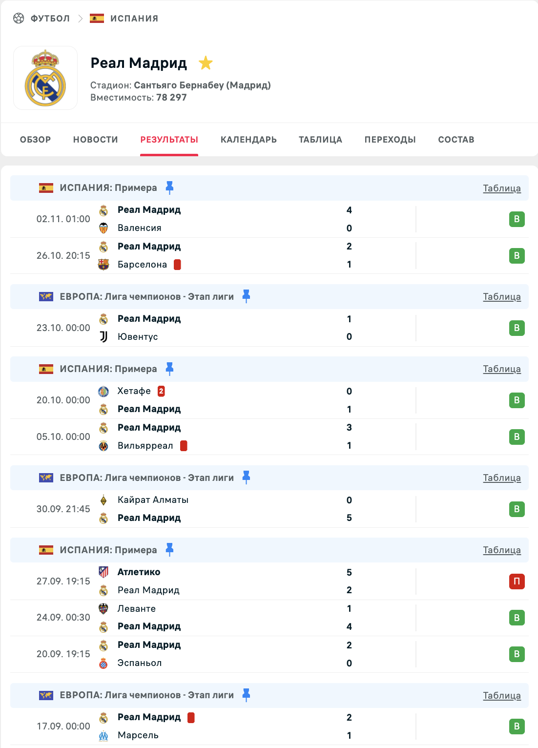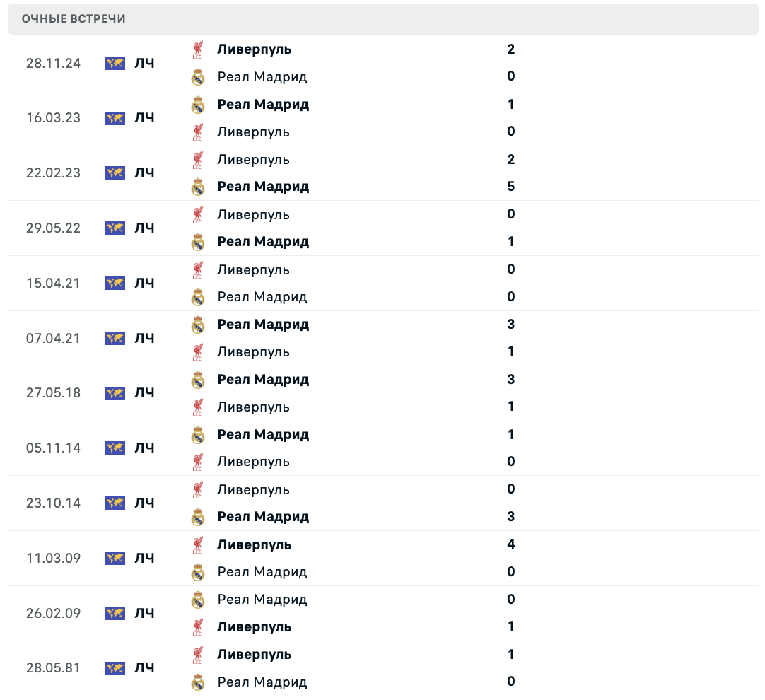 - 27.11.2024 (общий этап ЛЧ): "Ливерпуль" – "Реал" - 2:0