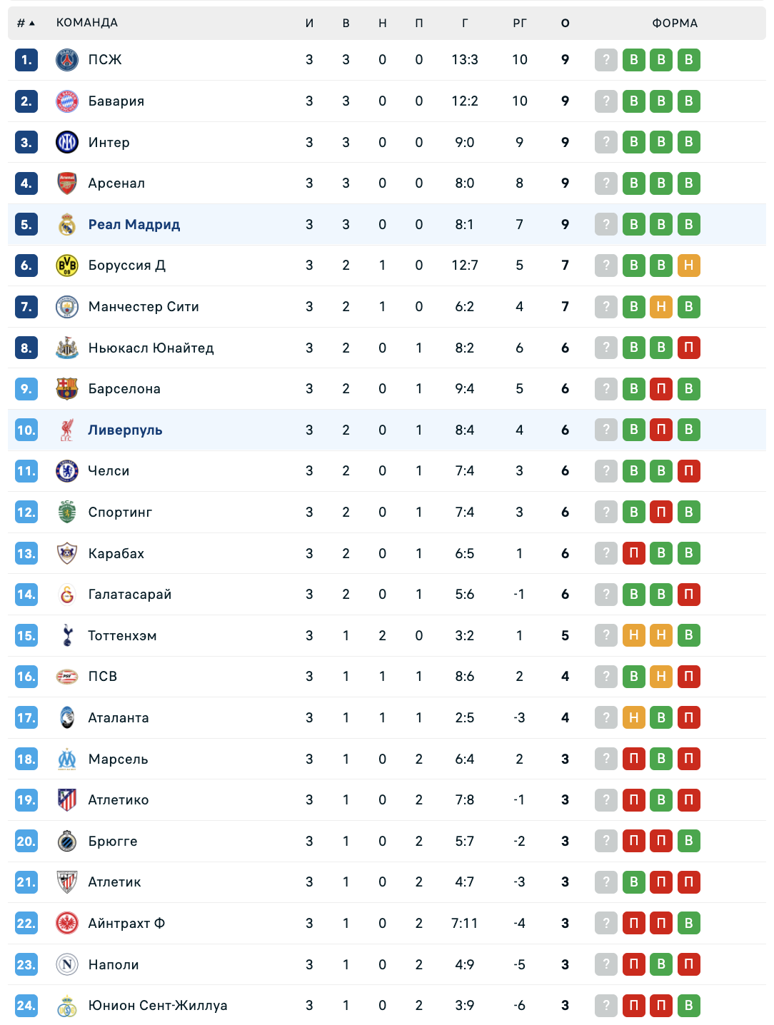"Ливерпуль" пока имеет 6 очков (разница 8–4) и идёт на 10-й строчке - вне зоны прямого выхода в 1/8, хотя и в группе лидеров, которые поборются за путёвки через раунд плей-офф. Чтобы подняться в топ-8, мерсисайдцам необходимо улучшать результаты в оставшихся турах.