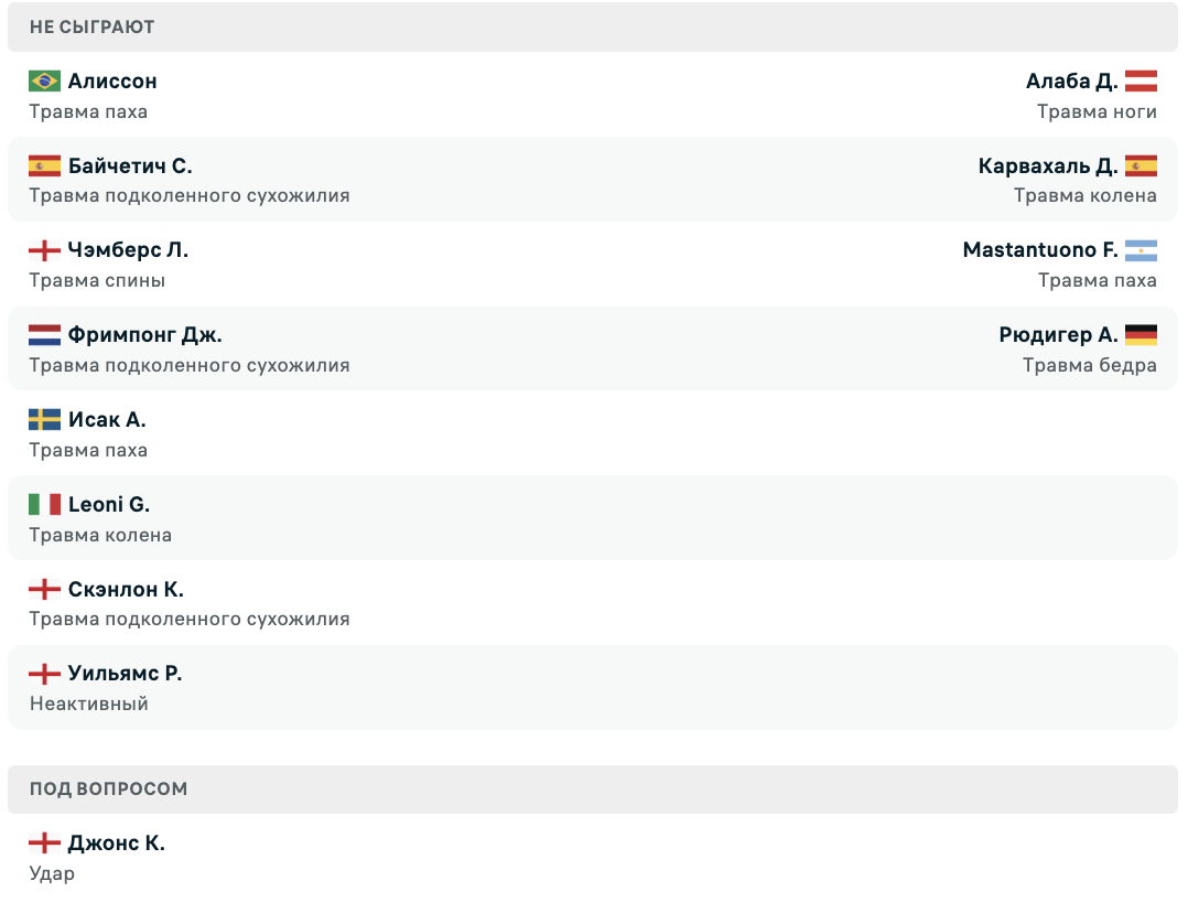 "Ливерпуль": у хозяев значительные проблемы с составом. Травмированы и точно не сыграют вратарь Алиссон Бекер, правый защитник Джереми Фримпонг и нападающий Александер Исак. По словам тренерского штаба, на поле также не выйдут полузащитник Кёртис Джонс (ещё не набрал форму после повреждения), молодой опорный хав Стефан Байчетич и 18-летний центральный защитник Джованни Леони - оба продолжают восстановление. Дисквалифицированных игроков у мерсисайдцев нет.