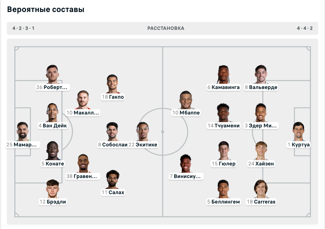 - Куртуа; Александер-Арнолд, Милитао, Хейсен, Каррерас; Вальверде, Чуамени; Гюлер, Беллингем, Винисиус; Мбаппе