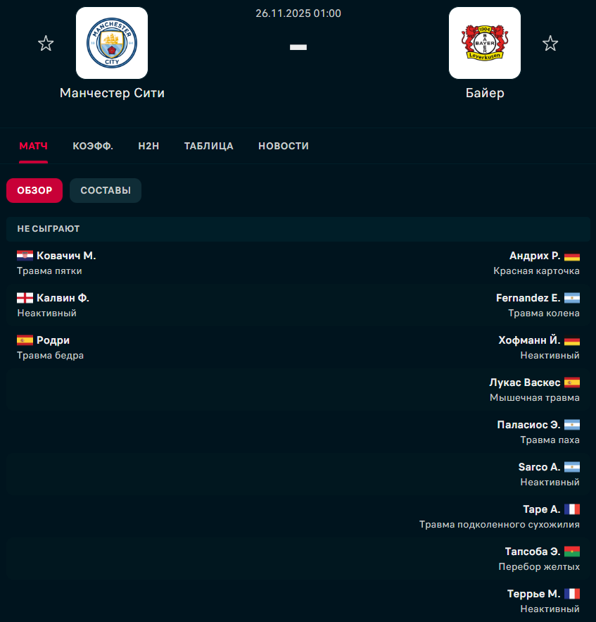 У "Манчестер Сити" не сыграют: Ковачич, Калвин и Родри. В "Байере" потери серьезнее: Андрих, Фернандес, Хофманн, Лукас Васкес, Паласиос, Сарко, Таре, Тапсоба и Терье.