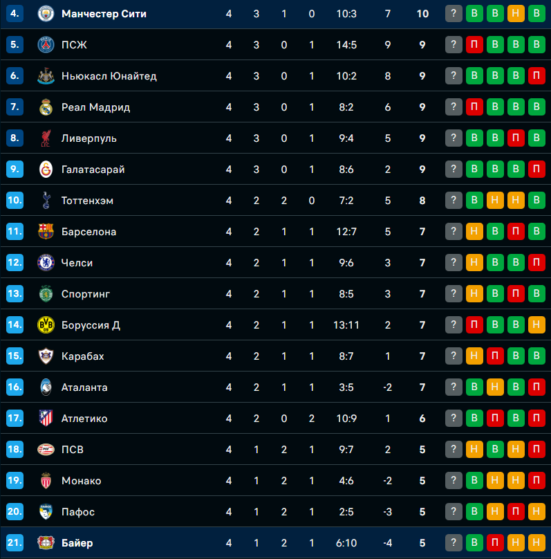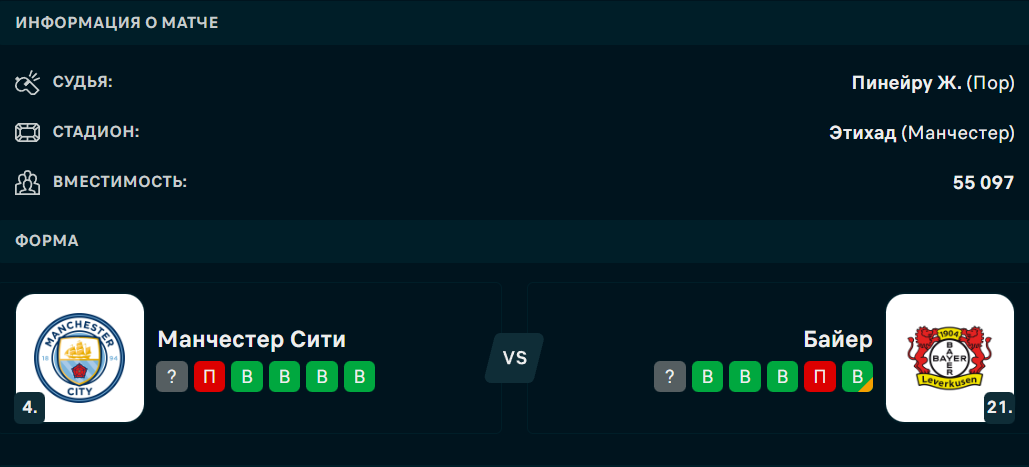 В ночь с 25 на 26 ноября состоится матч 5-го тура общего этапа Лиги чемпионов, в котором встретятся английский "Манчестер Сити" и немецкий "Байер", сообщает Спорт Шредингера.