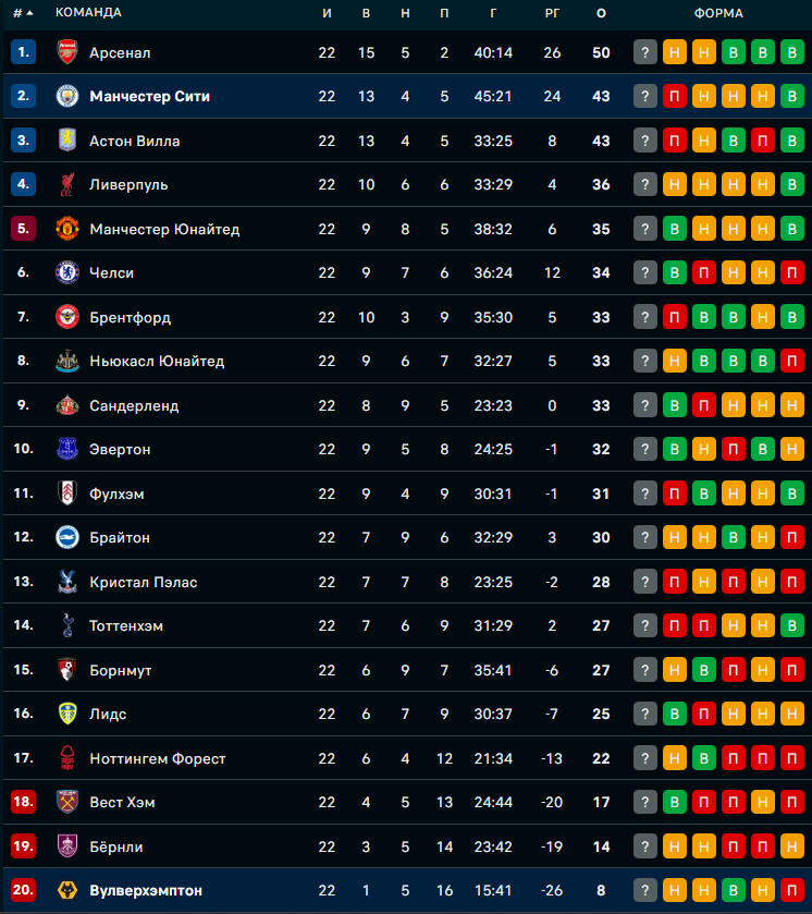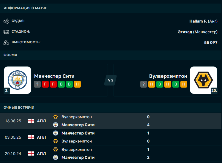 После 21 сыгранного матча в этом сезоне чемпионата Англии "Манчестер Сити" имеет 43 очка, а у "Вулвэрхэмтона" 8 баллов после такого же количества игр. В прошлом туре МС проиграл "Манчестер Юнайтед" со счетом 0:2, а "волки" поделили очки с "Ньюкаслом".