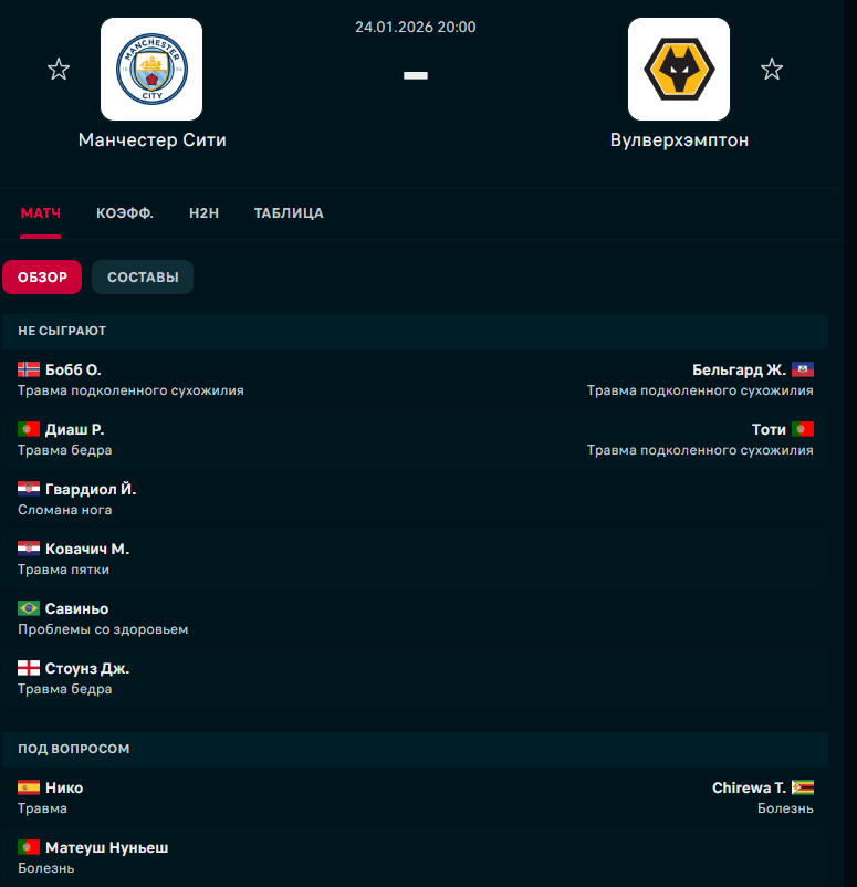 У "горожан" точно не сыграют Бобб, Диаш, Гвардиол, Савиньо и Стоунз. "Волки" не смогут рассчитывать на Тоти и Бельгарда.