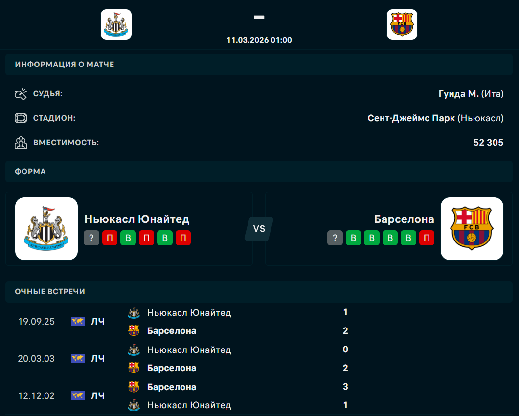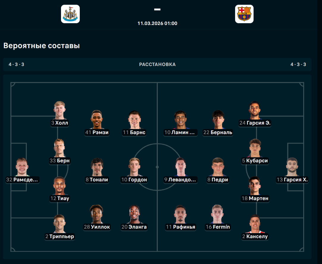 "Ньюкасл" одержал две победы и три раза проиграл в пяти последних встречах. У "Барселоны" четыре победы и одно поражение.Бруно, Шер, Милей, Крафт и Жилеспи. У каталонцев точно на поле не будет Бальде, Кристиансен, Кунде, Гави и Де Йонга.