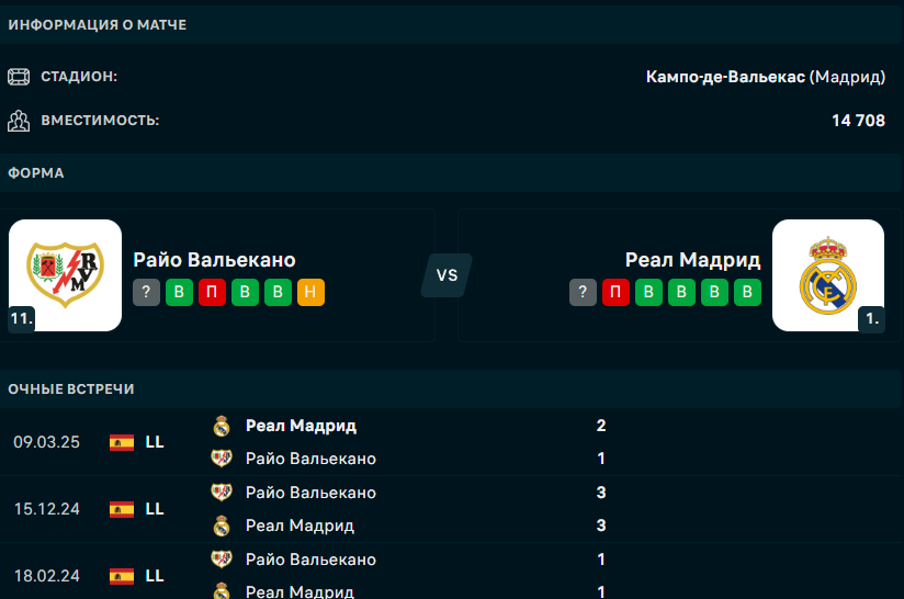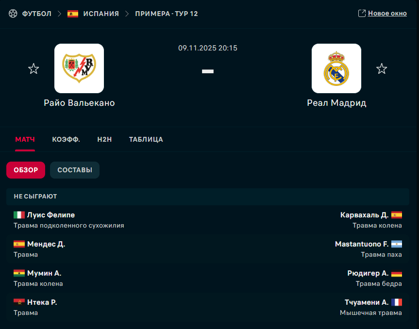 9 ноября в рамках 12-го тура испанской Ла Лиги состоится матч "Райо Вальекано" и мадридского "Реала", сообщает Спорт Шредингера.