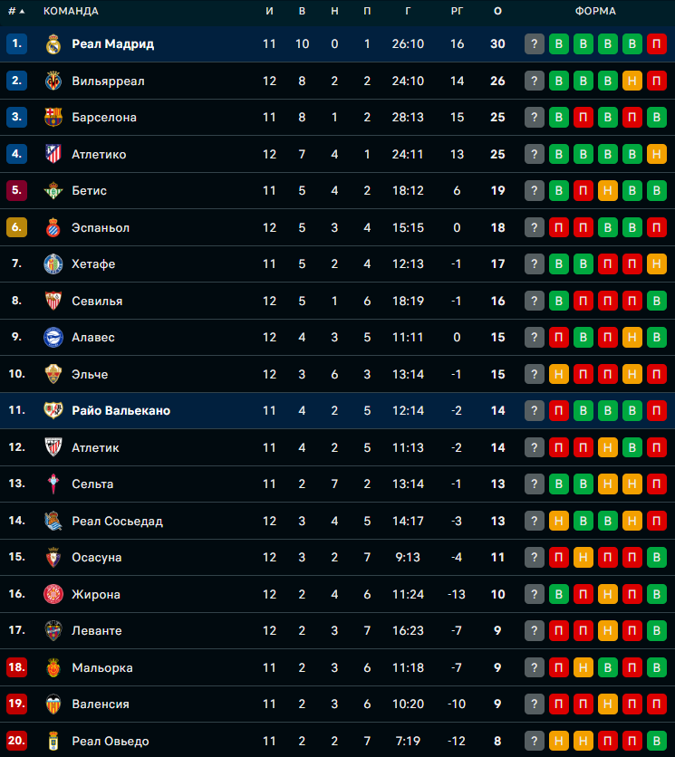 "Райо" идет на 11 месте с 14-ю очками. Шестиматчевая серия "Райо" без поражений осталась позади: в минувшем туре Примеры "пчёлы" со счётом 0:4 проиграли "Вильярреалу". Затем был матч Лиги конференций с "Лехом" (3:2), где "Райо" провалил уже первую половину, по итогам которой проигрывал в два мяча. Камбэк организовать удалось - "пчёлы" забили три гола после перерыва.