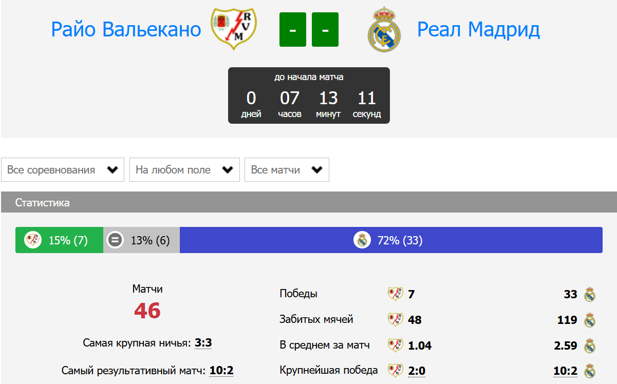 Исторически статистика очных встреч сейчас на стороне "Реала". За все время "галактикос" выиграли в 33 матчах. Шесть раз была зафиксирована ничья и семь игр завершились вничью. "Сливочные" забили 119 мячей, а "Райо" отличился 48 раз.