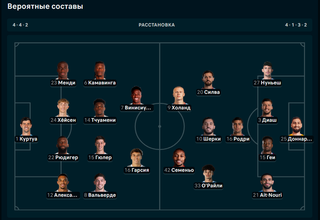 Кадровые потери есть у обоих клубов. У хозяев не сыграют Алаба, Беллингем, Себальос, Милитао, Фернандес, Мбаппе и Родриго. У гостей точно на поле не будет Гвардиола, Ковачича, Льюиса и Нипана.