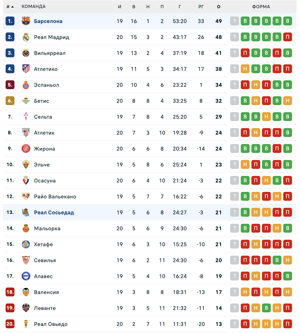 "Реал Сосьедад" идёт 11-м в турнирной таблице и опережает зону вылета на четыре очка. "Барселона" лидирует в Примере, опережая "Реал Мадрид" на четыре балла.