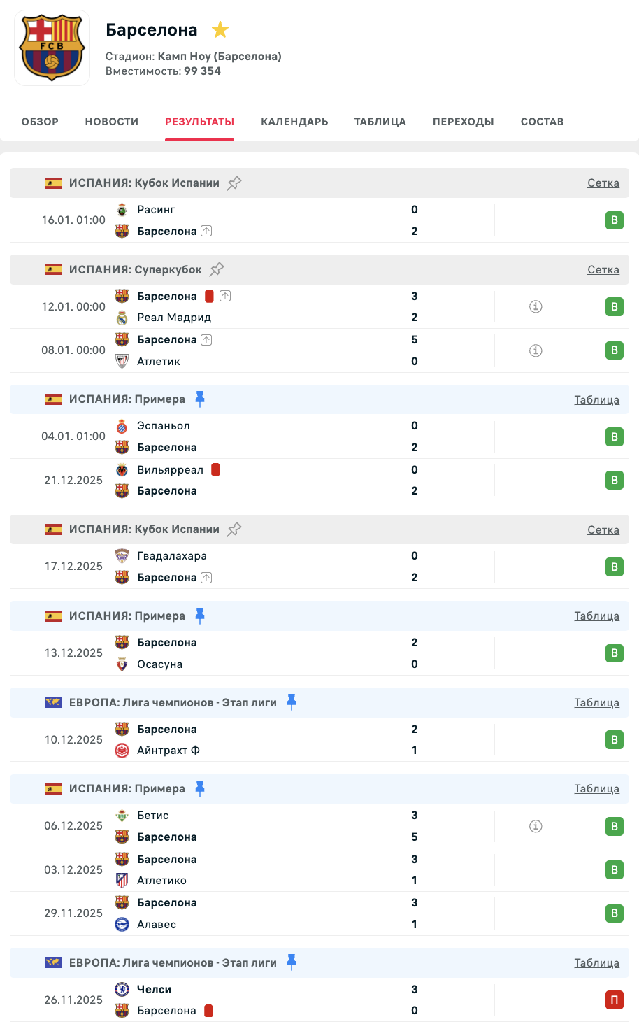 "Барселона" за неделю выиграла Суперкубок Испании и вышла в четвертьфинал Кубка страны, обыграв "Расинг" (2:0). Эта победа стала 11-й подряд - последний раз каталонцы проигрывали 25 ноября в матче Лиги чемпионов с "Челси" (0:3).