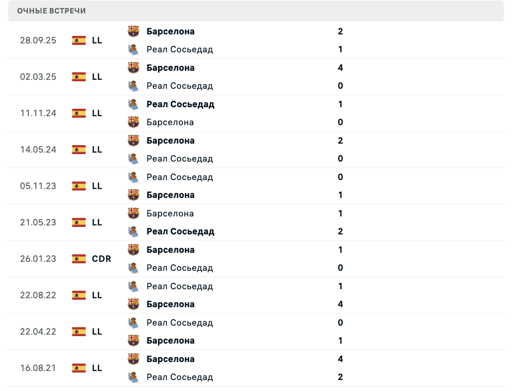 Очные встречи "Реал Сосьедад" - "Барселона"