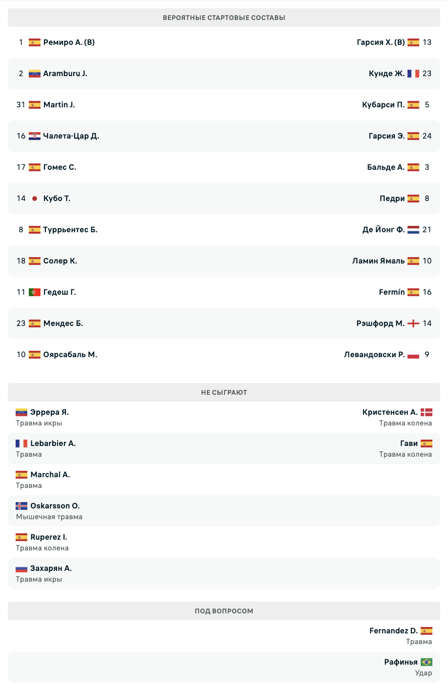 Френки Де Йонг отбыл дисквалификацию и готов вернуться в стартовый состав. Также ожидается возвращение Педри, Рафиньи, Эрика Гарсии и Фермина Лопеса. Возможен выход с первых минут Роберта Левандовски. Жоау Канселу официально стал игроком "Барселоны" и может дебютировать именно в этом матче. В лазарете остаются Андреас Кристенсен и Гави.