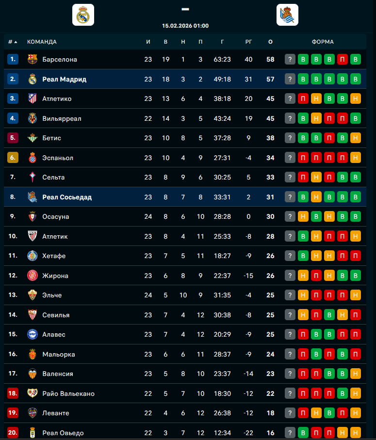 "Реал Сосьедад" идет на 8-м месте - 31 очко после 23 матчей. Команда одержала восемь побед, семь раз сыграла вничью и потерпела восемь поражений.