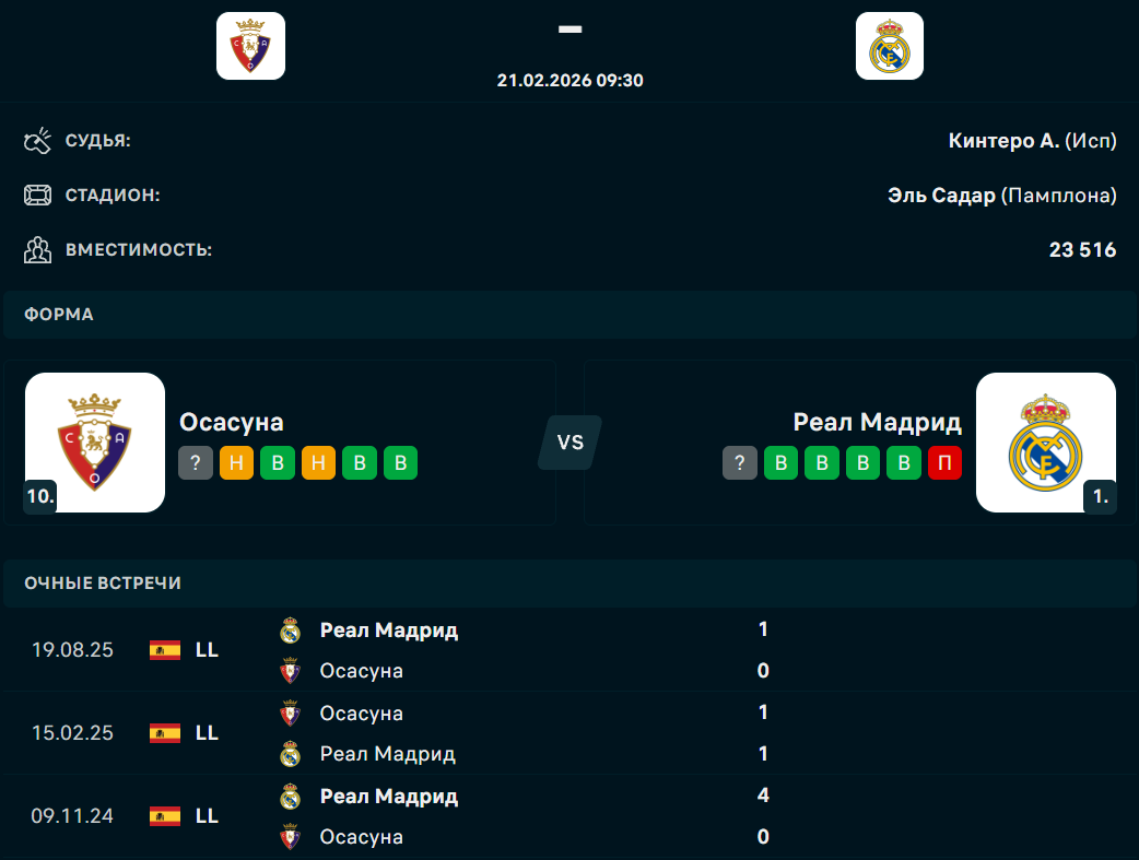 "Осасуна" одержал три победы и два раза сыграла вничью в пяти последних встречах. У "сливочных" показатели более убедительны: четыре победы и одно поражение.