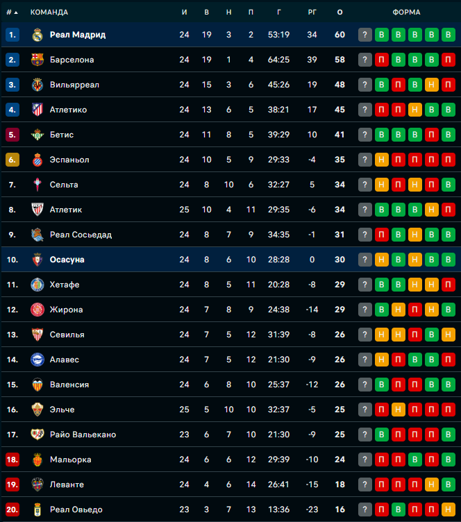 "Реал" же лидирует - 60 очков после 24 матчей. Команда одержала 19 побед, три раза сыграла вничью и потерпела два поражения.