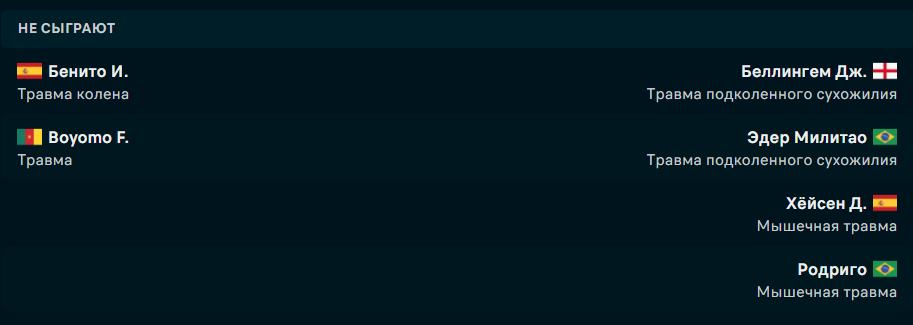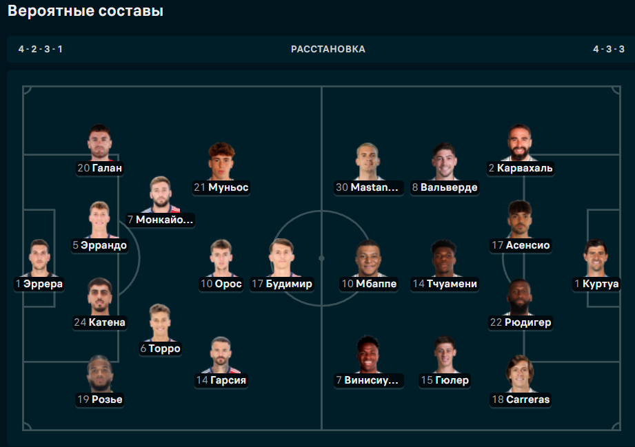 У "Осасуны" не сыграют Бенито и Бойомо, а "Реала" точно на поле не выйдут Беллингем, Милитао, Хейсен, Родриго.