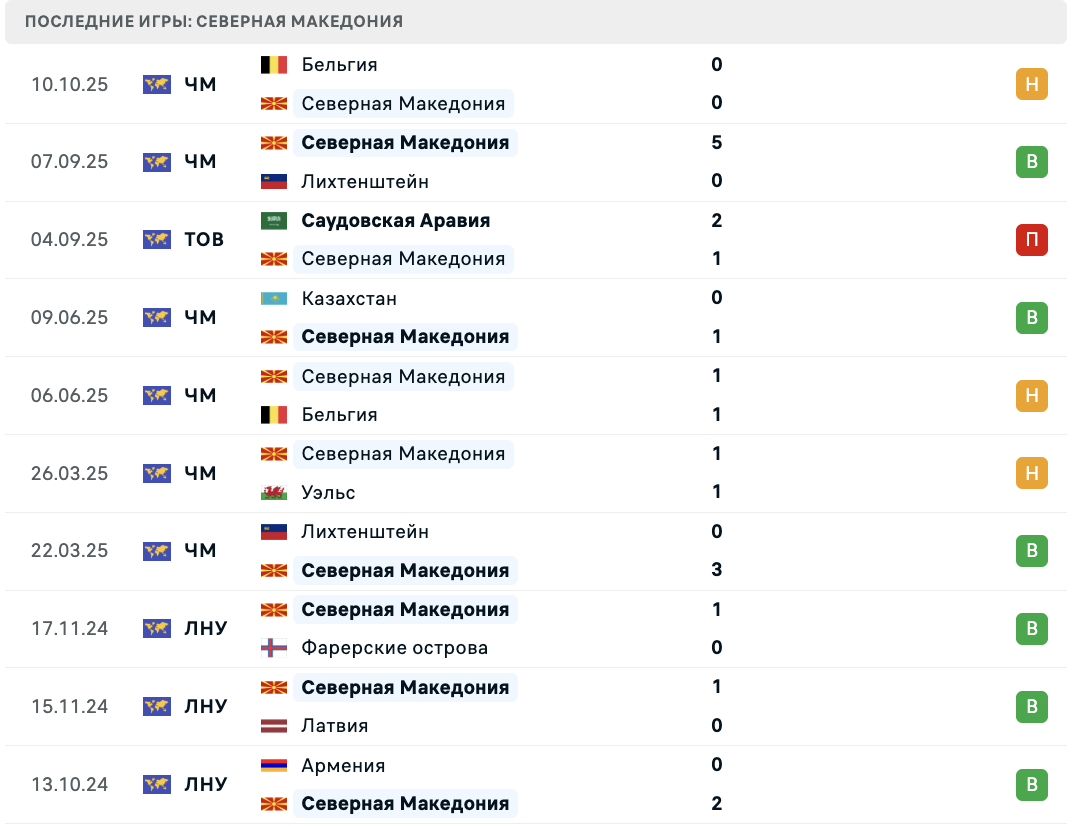 Северная Македония находится в отличной форме. В пяти последних матчах во всех турнирах у македонцев 2 победы, 2 ничьи и 1 поражение. Причем единственное поражение пришлось на недавний товарищеский матч с Саудовской Аравией (1:2), не влияющий на турнирную ситуацию. В отборе же северомакедонцы не проигрывают 13 официальных матчей подряд.
