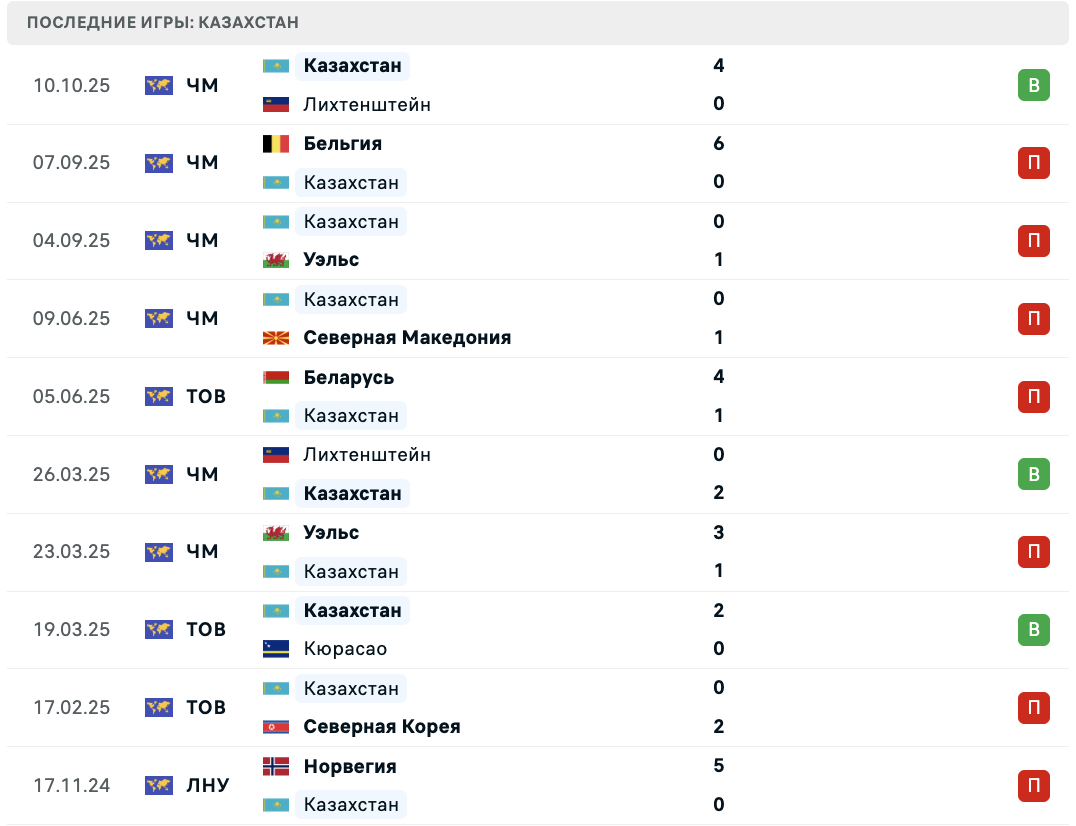 Казахстан только что прервал затяжную серию неудач. В предыдущих пяти играх - 1 победа и 4 поражени. Команда потерпела четыре поражения подряд (от Беларуси в товарищеской игре, затем от Северной Македонии 0:1 дома, Уэльса 0:1 и Бельгии 0:6) и лишь в последнем матче смогла реабилитироваться, разгромив Лихтенштейн 4:0.