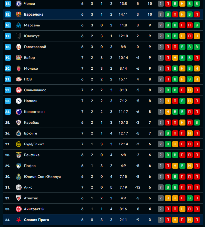 После шести туров "Барселона" идет на пятнадцатой строчке с 10 баллами, а "Славия" с тремя очками располагается на 34-ой позиции.