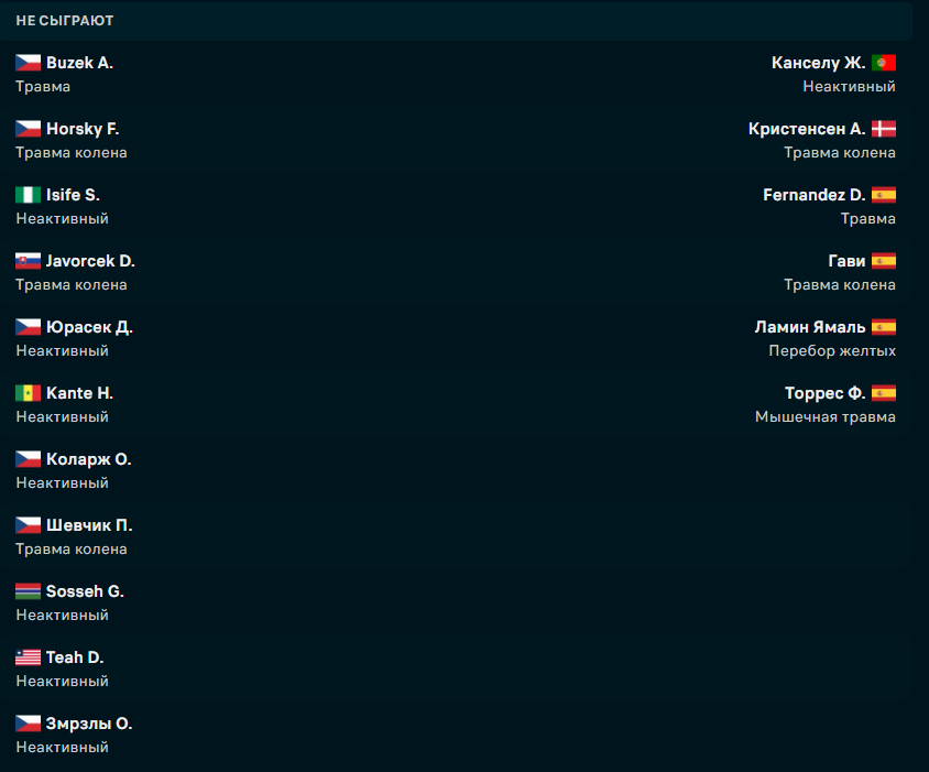 У "Славии" не сыграют Бузек, Хорски, Исифе Жаворчек,Юрасик, Канте,Коларш, Шевчик,Теая и Энрили. "Барселона" не сможет рассчитывать на Канселу, Кристиансена, Фернандеса, Гави, Ямаля и Торреса.
