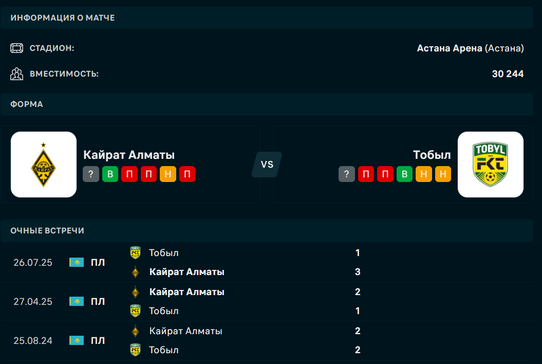 "Кайрат" стал чемпионом страны в прошлом сезоне, а "Тобол" стал обладателем Кубка страны. В последних двух очных встречах алматинцы обыграли "Тобол" (3:1, 2:1).Стоит отметить, что и обе команды трижды становились обладателями Суперкубка Казахстана: алматинцы выигрывали трофей в 2016, 2017 и 2025 году, а костанайцы в 2021, 2022 и 2024 году.