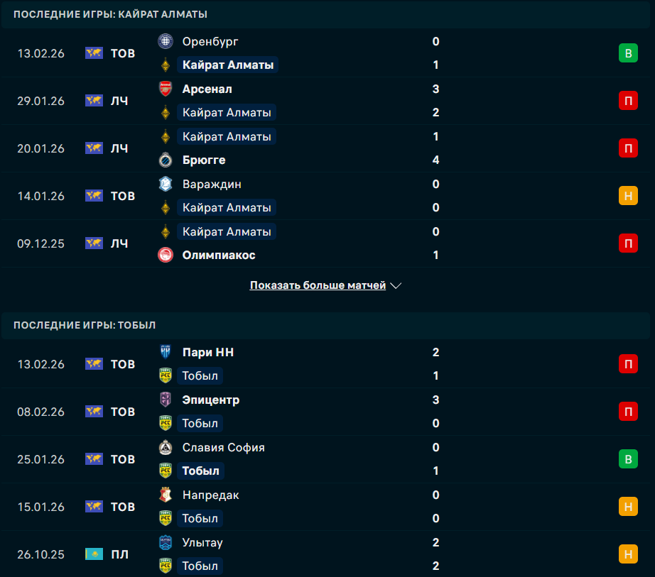"Кайрат" с декабря прошлого года провел пять матчей, из которых три в основном раунде Лиги чемпионов. Все официальные встречи были проиграны: "Арсеналу" (2:3), "Брюгге" (0:4), "Олимпиакосу" (0:1). В двух товарищеских встречах случилась ничья с "Варждином" (0:0) и победа над "Оренбургом" (1:0).
