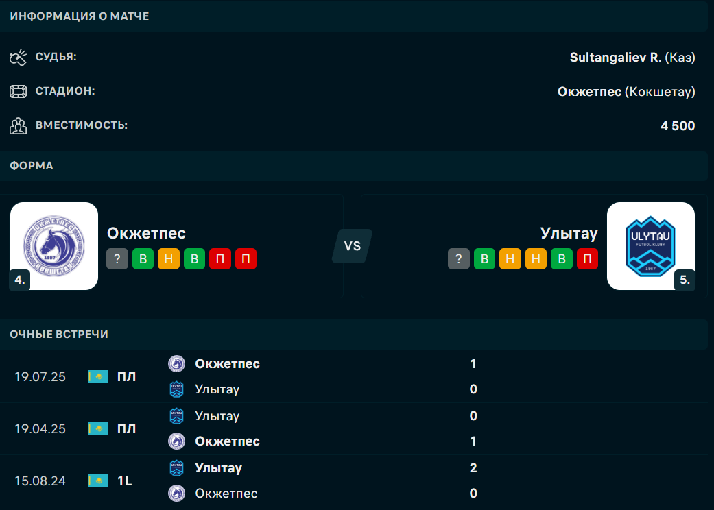 В 14:00 в Кокшетау "Окжетпес" примет жезказганский "Улытау". К этому противостоянию команды подошли находясь по соседству в турнирной таблице. "Окжетпес" с четырьмя баллами на пятой строчке, а "Улытау" с идентичными показателями на пятой. Последние три очные встречи команд завершились в пользу команды из Кокшетау.